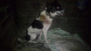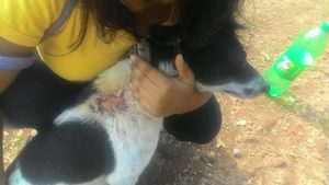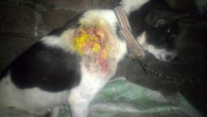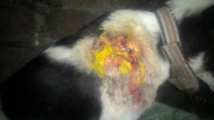 This dog was attacked by some scoundrels with acid,crying desperately in pain.We were informed after two days in the mean time they have tried treating it with phenyl,making it worse..the wound is being treated by us .she is in lot of pain we are trying to ease her pain..stopped eating…is on iv fluids..